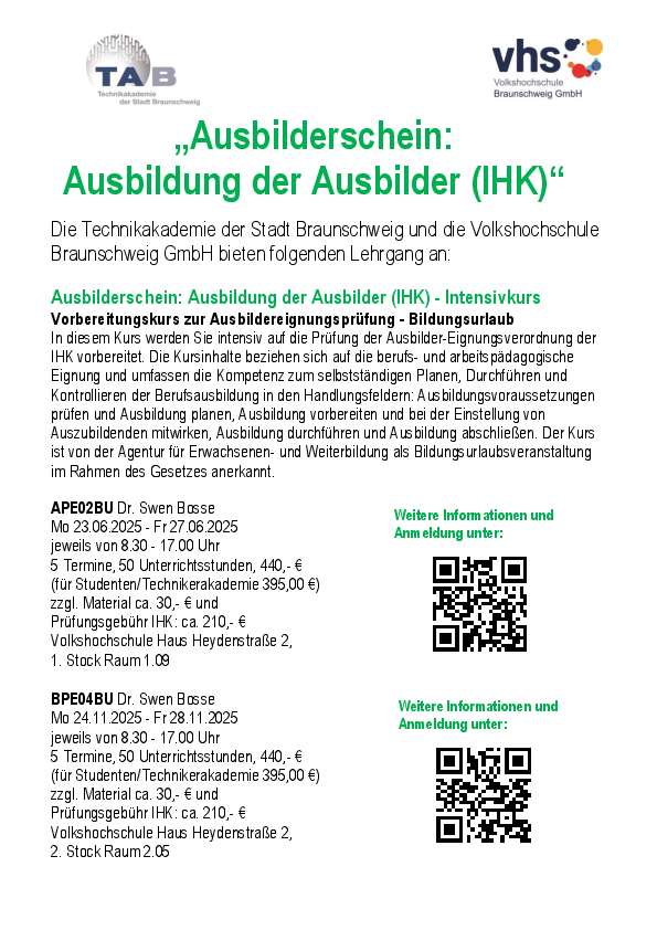 AdA Ausbildung der Ausbilder (IHK) | VHS Braunschweig | Termine in den Osterferien, den Sommerferien und den Herbstferien | Kosten: 440,- €, zzgl. Material ca. 30,- € und Prüfungsgebühr IHK: 210,- € |